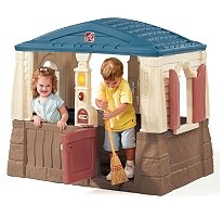 Electronic play phone and doorbell.Molded-in floor with integrated drain holes.Molded-in kitchen table with faucet, burner, and two seats.Working dutch door and shutters..